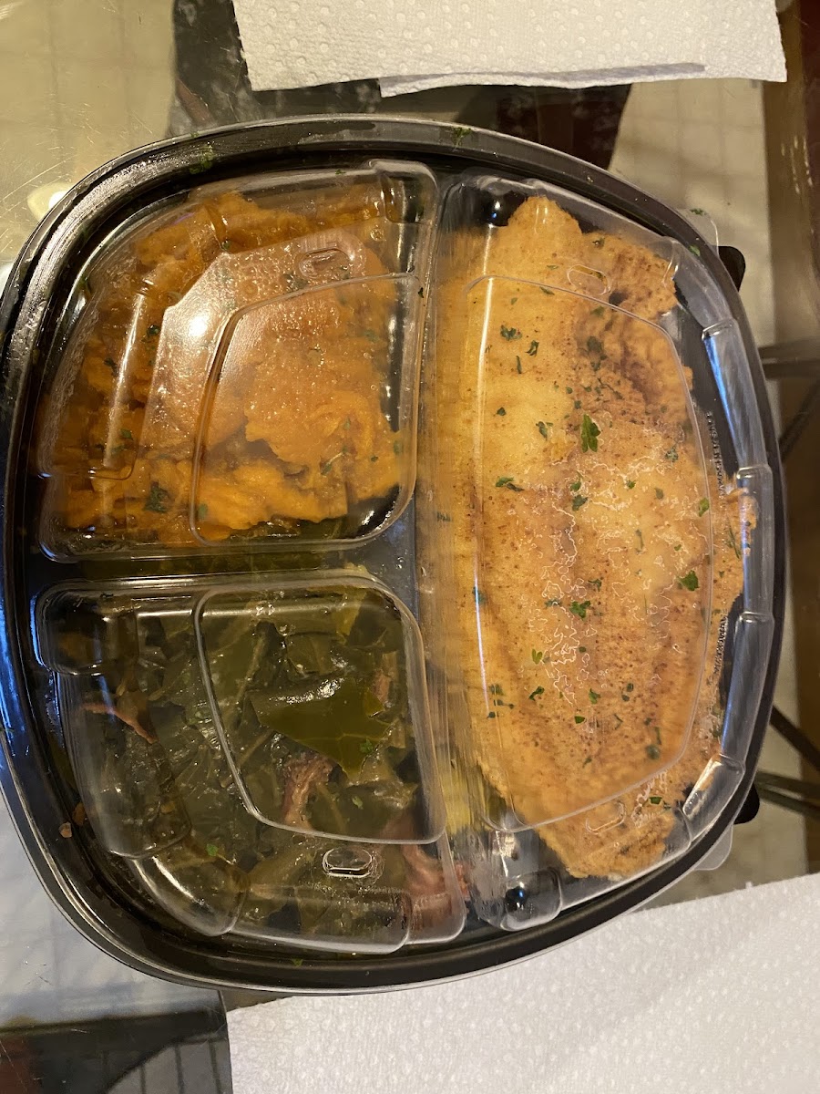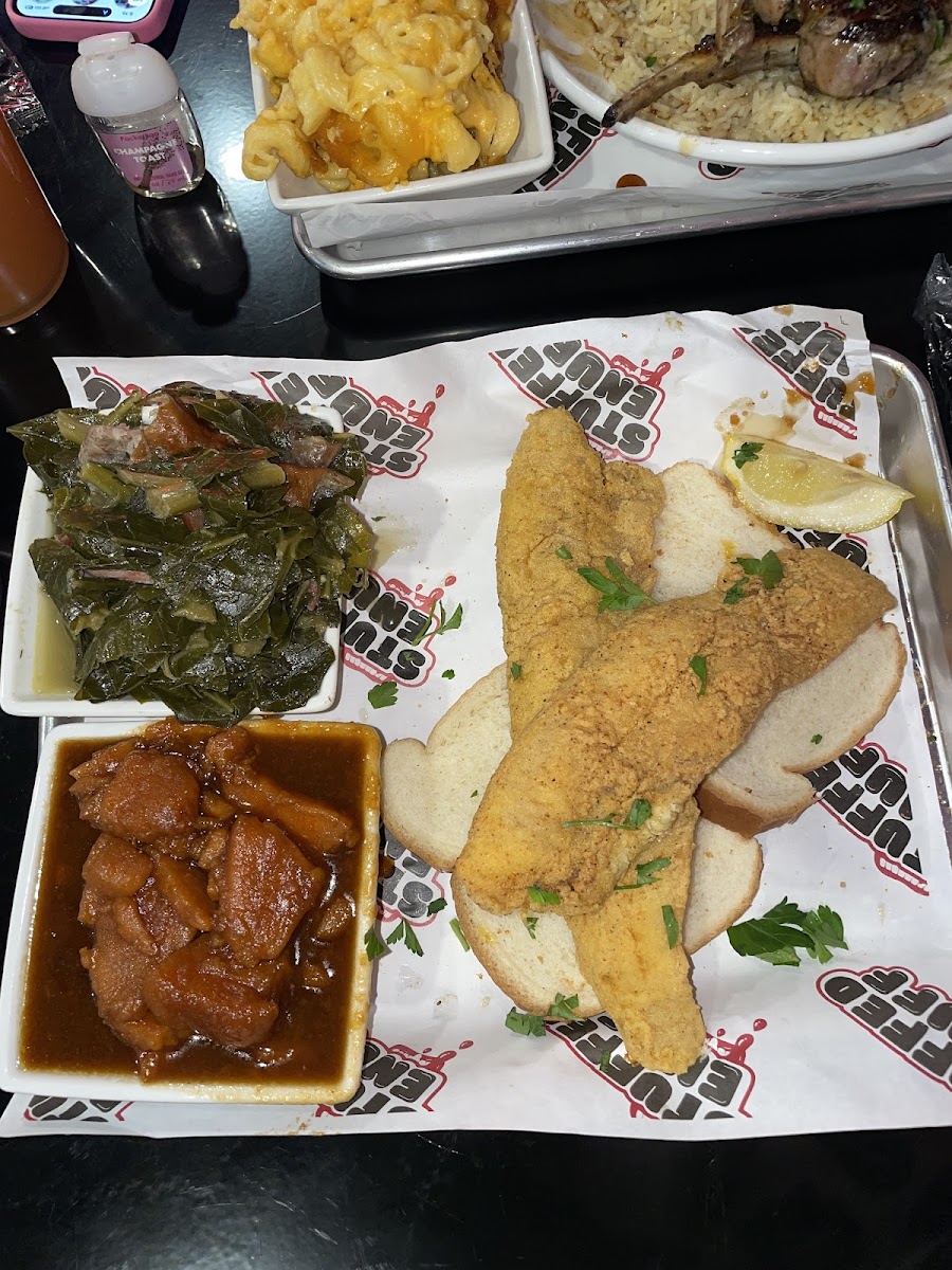 One of the highlights of the menu is their Mac & Cheese. Creamy, cheesy, and perfectly baked, it’s a dish that brings comfort in every bite. If you're in the mood for something with a bit more flavor, the Collard Greens with Smoked Turkey is a standout. The greens are tender, and the smoky turkey adds a savory depth to this classic Southern dish. Another fan favorite is the Catfish Dinner with Greens and Sweet Potatoes. The crispy, golden-brown catfish pairs wonderfully with the sweet potatoes and flavorful greens, making it a filling and satisfying meal.